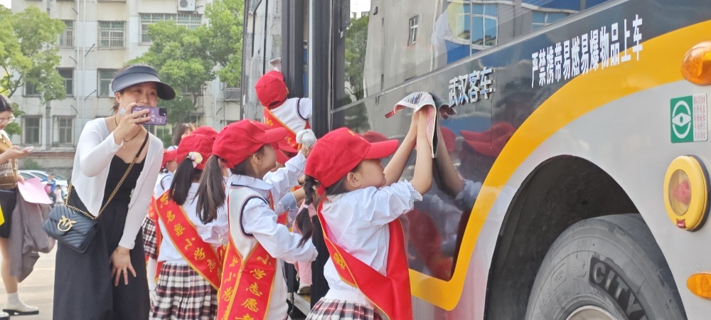 圖/同學(xué)們體驗公交車清潔過程,自備小抹布為車身擦拭水漬,共護(hù)公交出行環(huán)境,倡導(dǎo)綠色出行。